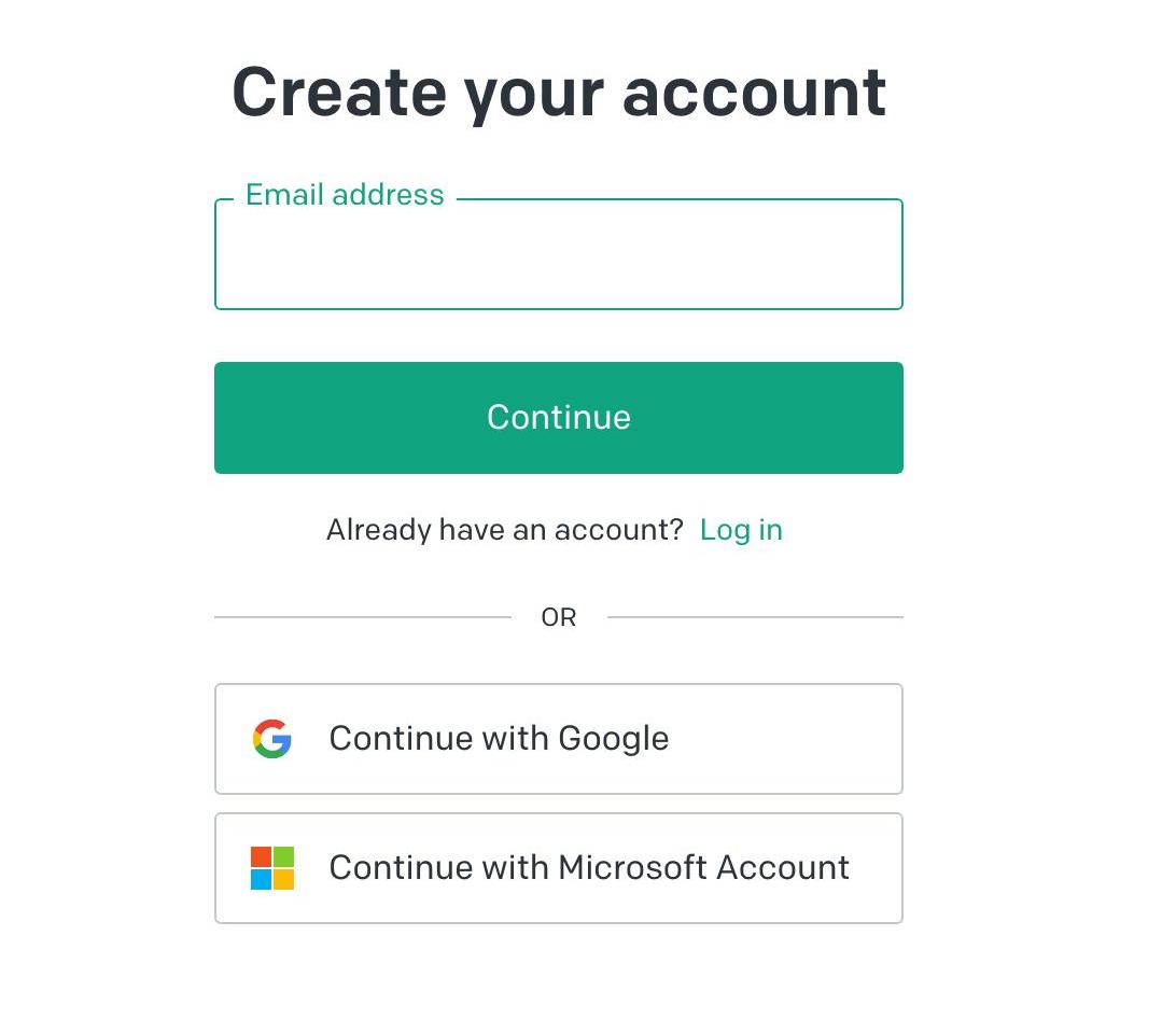 首先是打開ChatGPT的賬戶注冊頁面。谷歌注冊或者郵箱注冊都可以,無所謂,這里用郵箱注冊作為例子。