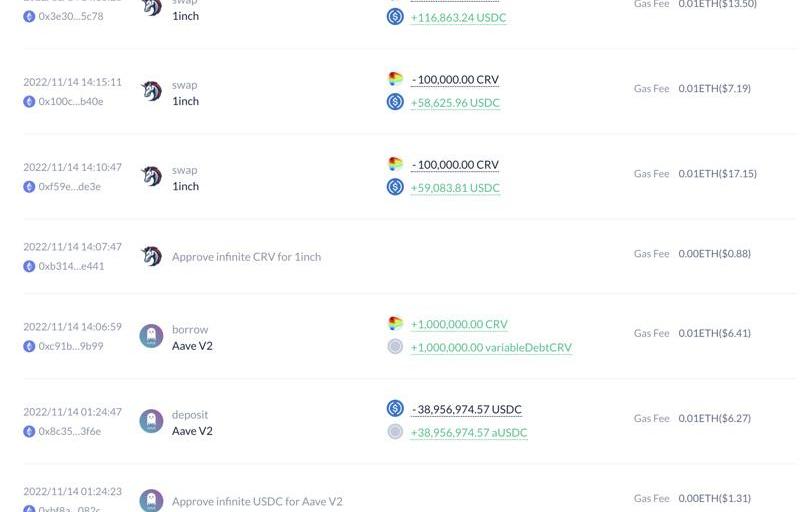 鏈上數據顯示,11?月?14?日,神秘巨鯨?0x57e在Aave充入了約?3900?萬USDC,并不斷借出CRV砸盤,或是此舉動被解讀為“市場恐慌”,并導致了接下來市場一路下跌。