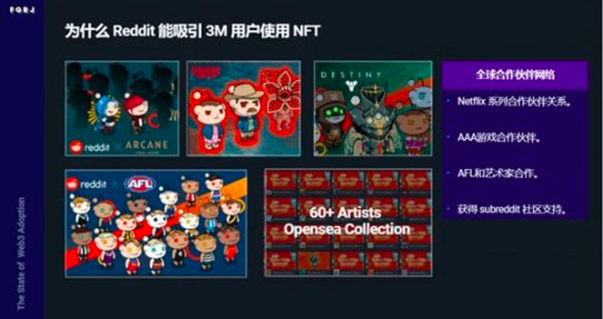 Reddit是一個娛樂、社交及新聞網站,他在一個月的時間,推動4300萬用戶進入「Web3」。之所以加引號是因為很多用戶并未直接了解Web3,只是利用Reddit創建了錢包,購買和交易了NFT。截止報告發布前,其NFT頭像持有者已經超過400萬。