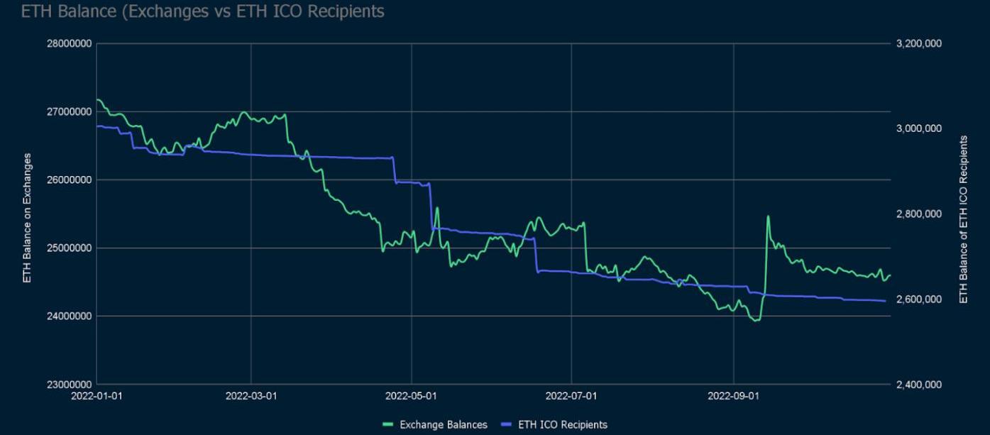 隨時間的推移,ETHICO參與者錢包地址是否一致看好ETH未來,看漲?ETHICO參與者的錢包余額自2020年以來穩步下降,從2020年1月到2022年11月,ETH余額從411萬個ETH下降了64%至259萬個ETH。盡管ETH余額有下降趨勢,但也有其他可能導致這種下降的因素——其他EOA的ETH轉移的多跳、向交易所的存款以及將ETH作為抵押品部署到特定的DeFi應用程序。鑒于大多數大型鯨魚和早期投資者的投資翻了好幾倍,這導致了ETH的大量拋售。自2022年初以來,超過41%的ETH預挖供應已發送到交易所。