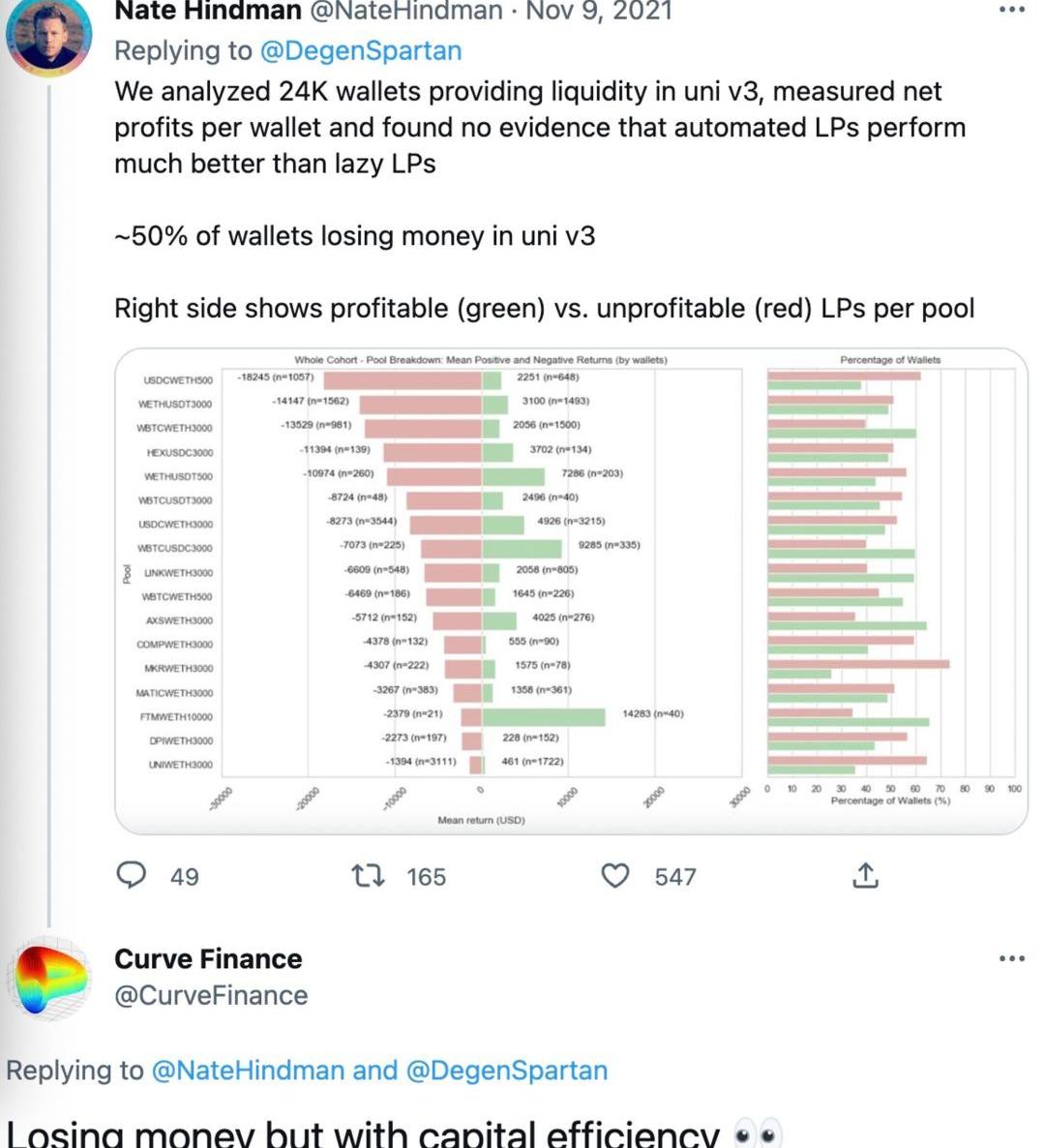 如文中表明,在V3于5月5日至9月20日推出期間,TVL>1000萬美元的17個資產池,交易量超過100B美元,為LP賺取了約2億美元的費用。然而,在同一時期,因IL而損失超過2.6億美元,導致凈損失超過6000萬美元。也就是說,V3的LP的50%左右都在虧損。