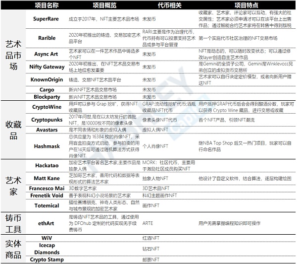 下表梳理了NFT在加密藝術領域的主要項目以及各項目的特點:
