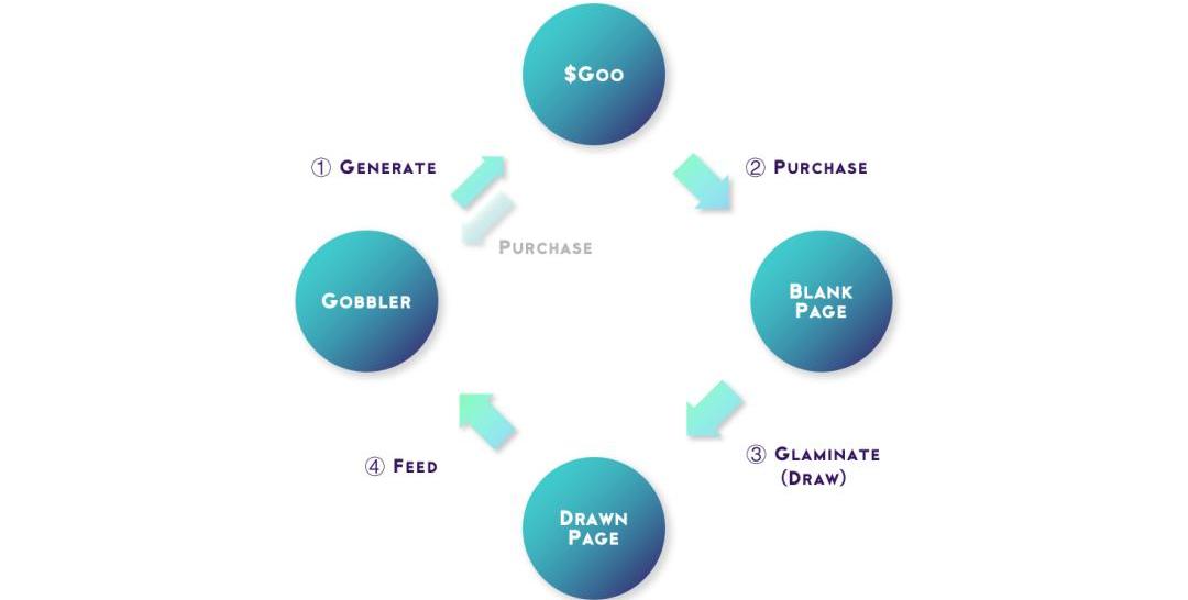 持有Gobblers持有Gobblers能產出$Goo消耗$Goo購買Gobblers->合成大怪獸->產出更多的$Goo購買BlankPages進行創作變成DrawnPages持有的Gobblers吃掉DrawnPages