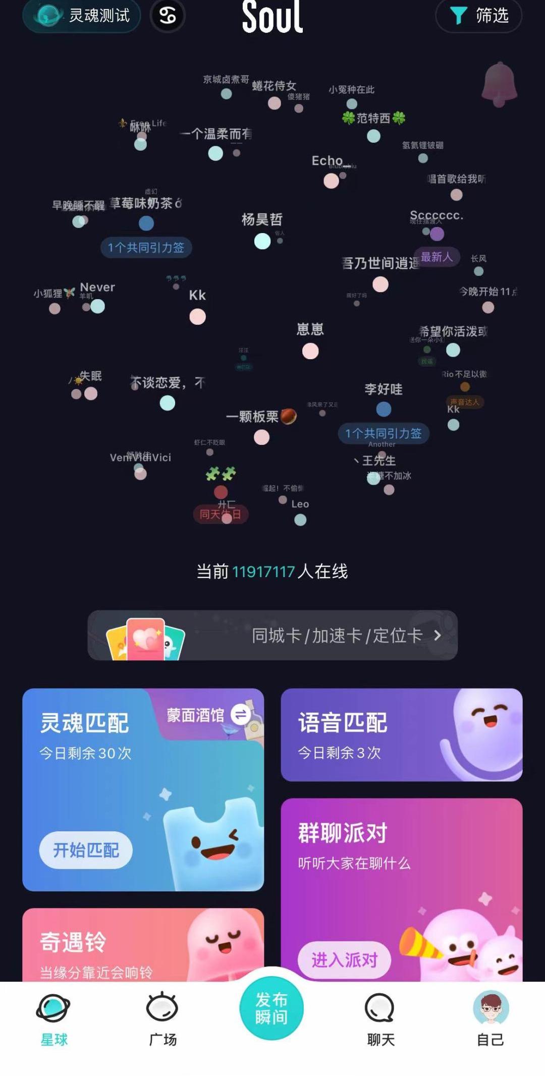 用戶陸啟發現,Soul最近幾年多了很多「氪金」的入口,比如在社交匹配功能中,想匹配同城用戶需要花費10Soul幣購買「同城卡」,想匹配指定城市的用戶,得拿11Soul幣購買「定位卡」,「看來這靈魂社交,也得金錢先行。」此外,站內的「Soul游樂園」社交游戲空間里,爆彈喵、Soul狼人等游戲也需要消耗Soul幣來提升能力或裝扮角色。