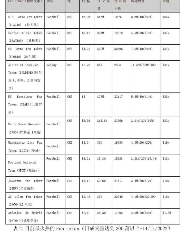 體育這個產業本來就十分龐大,體育的粉絲經濟也很發達。體育類Fantoken占Fantoken生態的大多數,而且也是受到最多關注的。目前體育Fantoken也有很多種類,包括最受歡迎的足球、其次賽車、美式足球、欖球、籃球、自由搏擊、網球以及冰上曲棍球。足球的Fantoken經濟是最發達的,目前為止有多達65支球隊已經與公鏈Chiliz,幣安,火幣以及OKX成為了合作伙伴,并推出專屬他們的Fantoken。