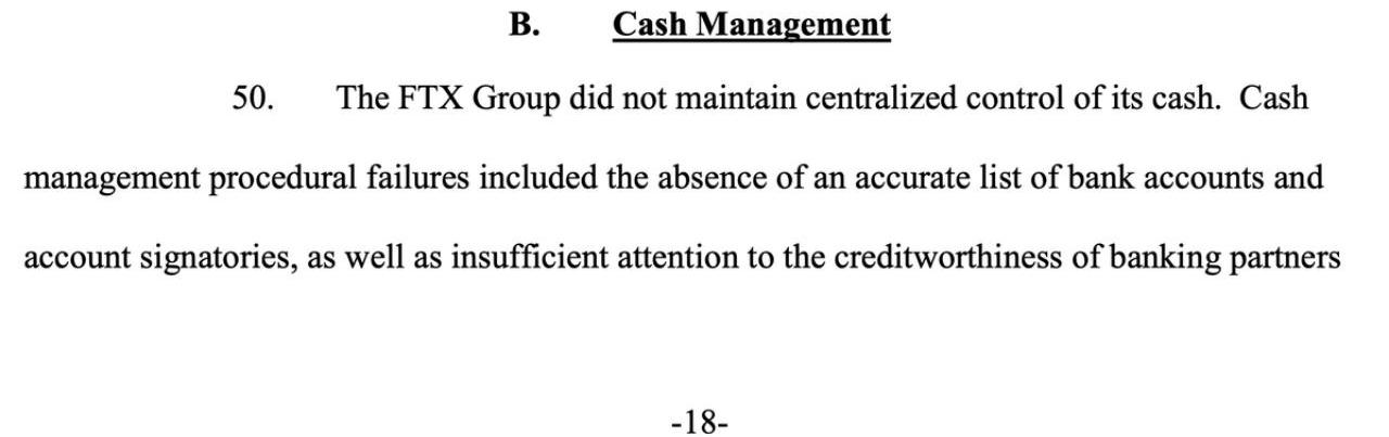 第50段:“FTX集團并沒有對其現金保持集中控制”--他們甚至沒有保存他們所有銀行賬戶的流水清單!