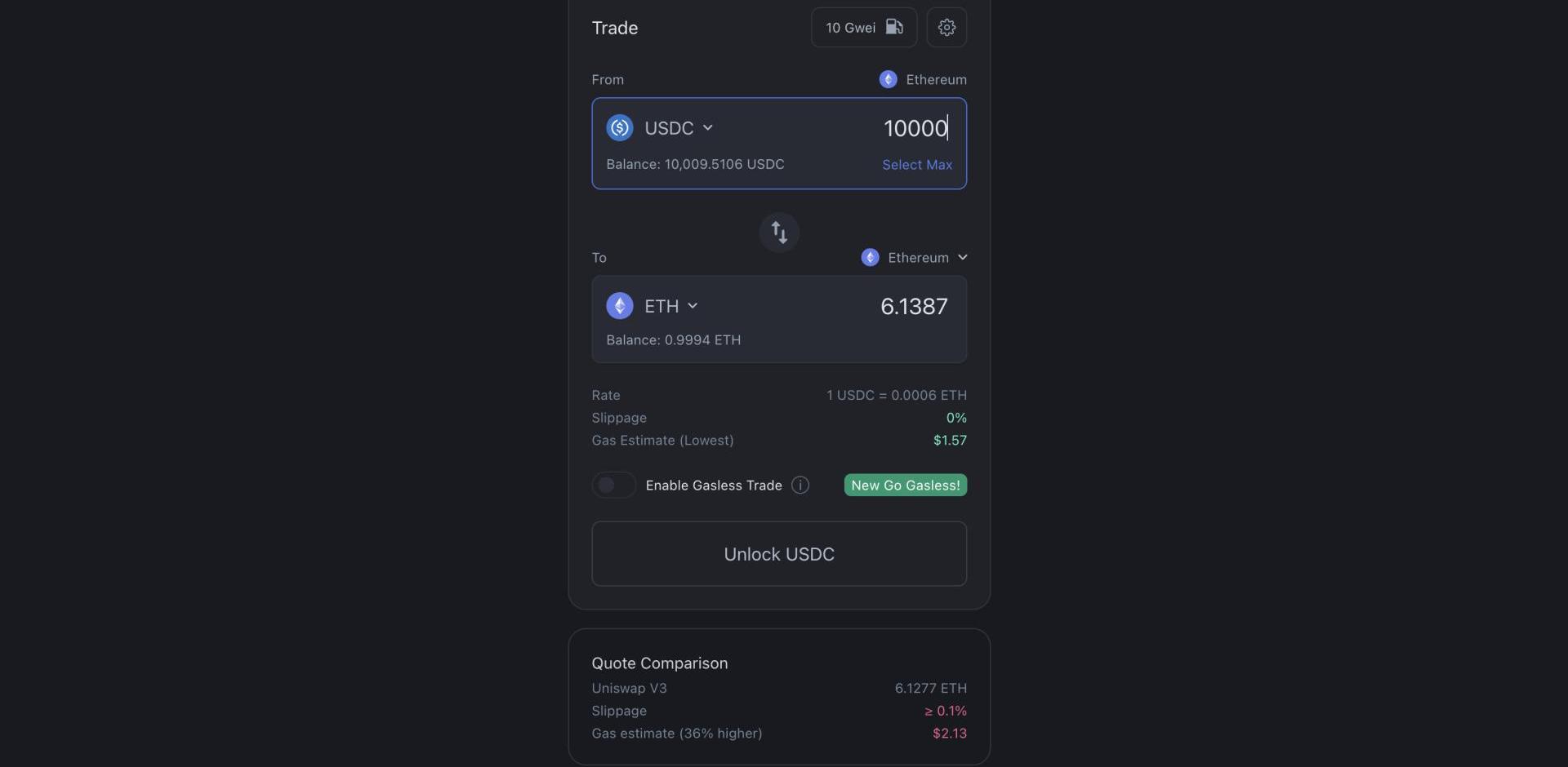 在PANews7月22的測試中,以下圖中將10000USDC兌換為ETH為例,Hashflow的報價確實優于UniswapV3和1inch提供的價格。UniswapV3上的兌換比例和Hashflow“報價對比”中顯示的結果一致。但是,若將交易方向反轉,如將6ETH兌換為USDC,Hashflow的兌換比例則不如UniswapV3。如果繼續增加單次交易的數額,Hashflow的兌換比例將變得較差,因此目前Hashflow主要適合金額較小的一些交易。