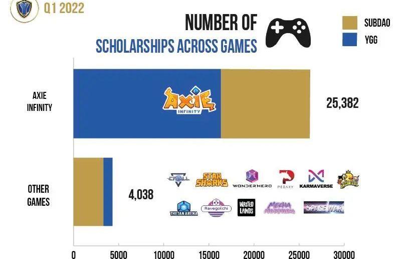 自YGG2022Q1社區更新之后,YGG所有網絡共有29548個獎學金項目,其中25382個是AxieInfinity獎學金。