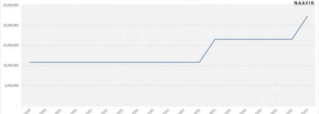 然而,持續收入卻是另一番景象。根據白皮書顯示,SkyMavis并不能直接從AxieInfinity盈利,而是每個月從分配計劃接受一定量的AXS代幣,如果我們計算分配量,可以得到以下圖表: