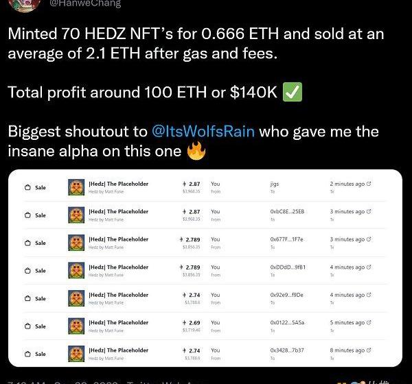玩過魔獸爭霸3的朋友想必都知道,獸族的英雄「劍圣」有一個叫「致命一擊」的技能,俗稱「跳劈」。當這個技能觸發的時候,平A就會轉成暴擊,一下帶走敵人。Hanwe的挑戰成功像極了一次暴力的「跳劈」——他一口氣鑄造了70個「HedzbyMattFurie」NFT,并且以2.1ETH的均價全部售出,僅通過這一個項目就收獲了近100ETH的利潤。