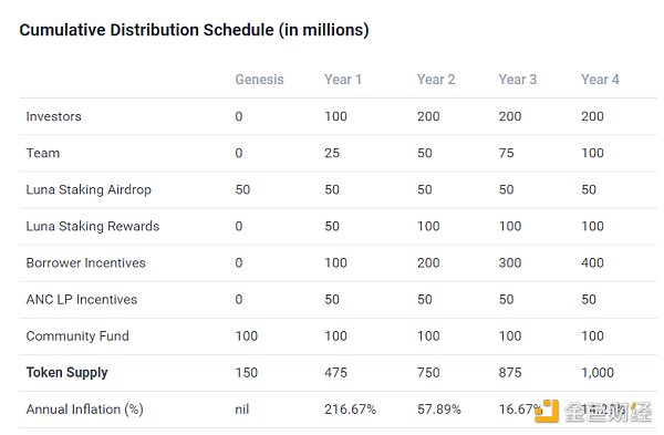 1.5億枚ANC在Anchor Protocol上線時釋放,其中33.3%共計5000萬枚ANC空投給LUNA質押者,快照區塊為2179600,66.7%計1億枚ANC作為社區基金。